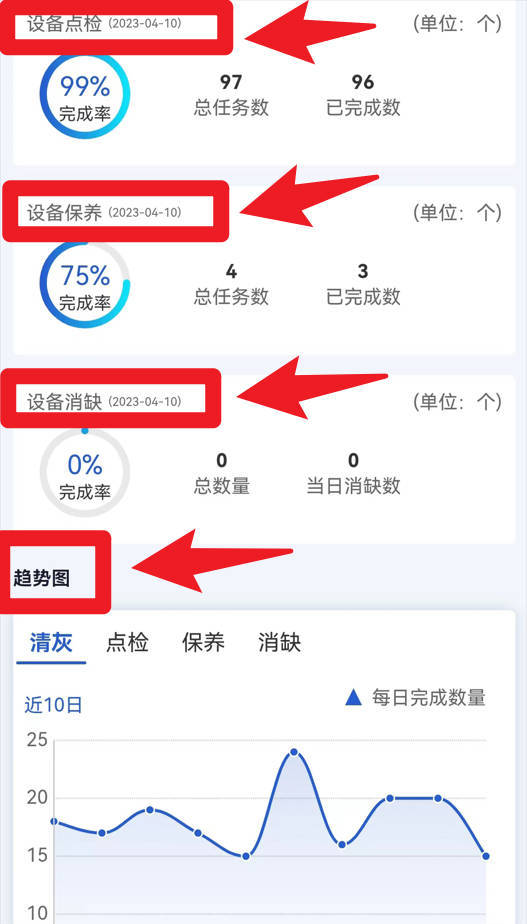 5、在数据统计页面,用户能够查看设备点检、保养和消缺任务的完成率,并通过趋势图了解近十日的任务变化,便于掌握整体运行情况。