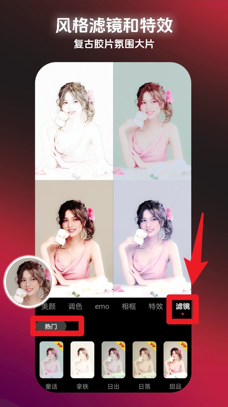 4. 在“滤镜”功能中挑选不同风格滤镜,为照片添加童话、日出、甜品等氛围效果。