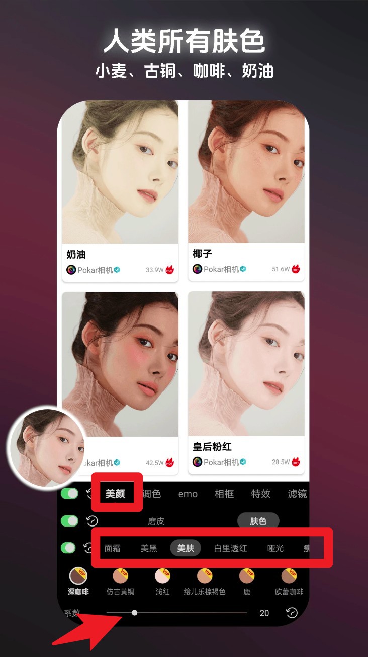 3. 进入“美颜”功能,选择合适的肤色与美肤模式,支持多种色调调整,让肤色更自然。