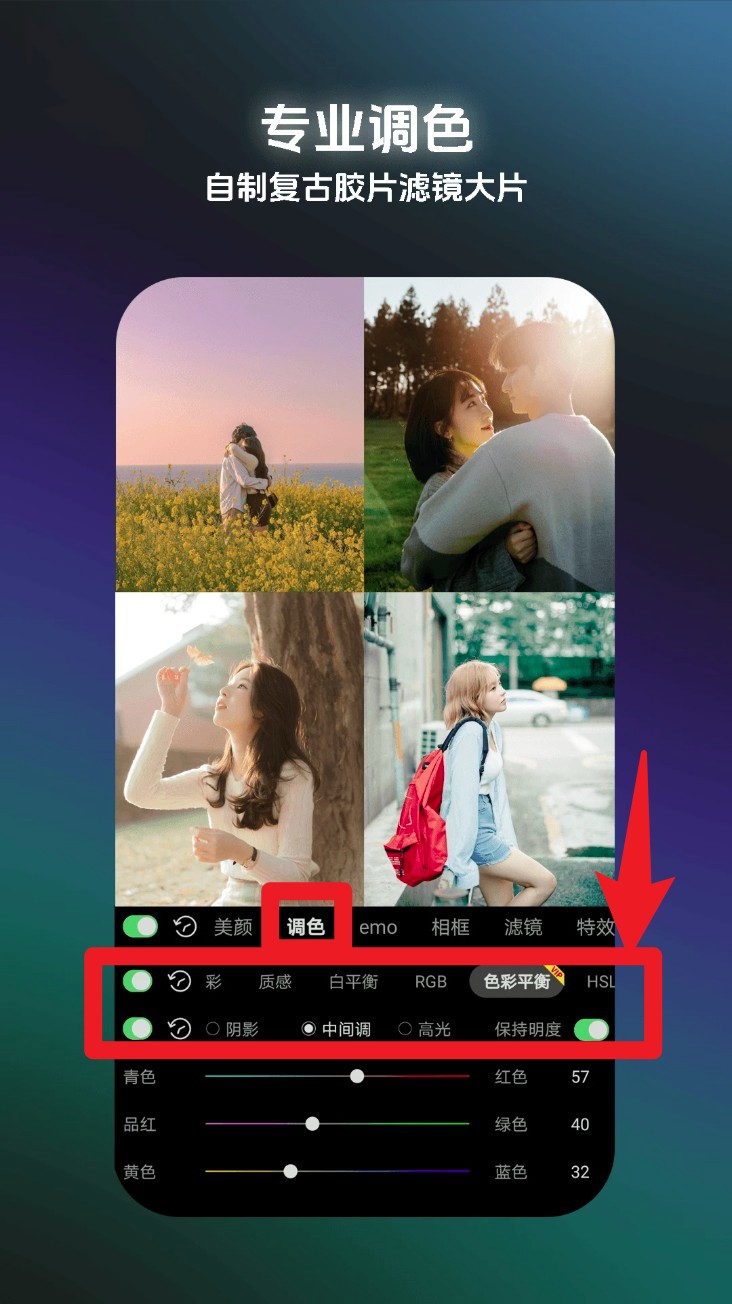 2. 打开“调色”功能,调节色彩、质感、白平衡等参数,自定义复古或清新风格的画面效果。