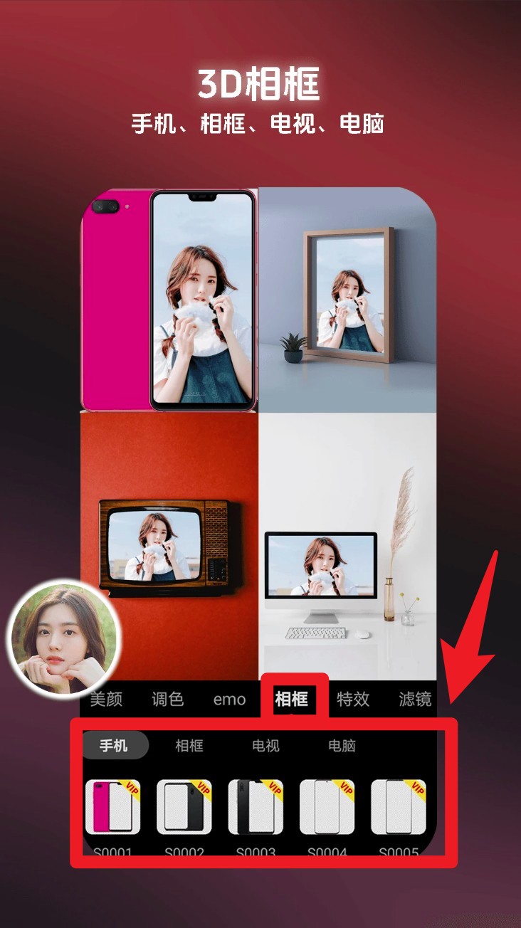 1. 在“相框”功能中选择3D相框效果,可将照片置入手机、相框、电视或电脑等多种展示场景。