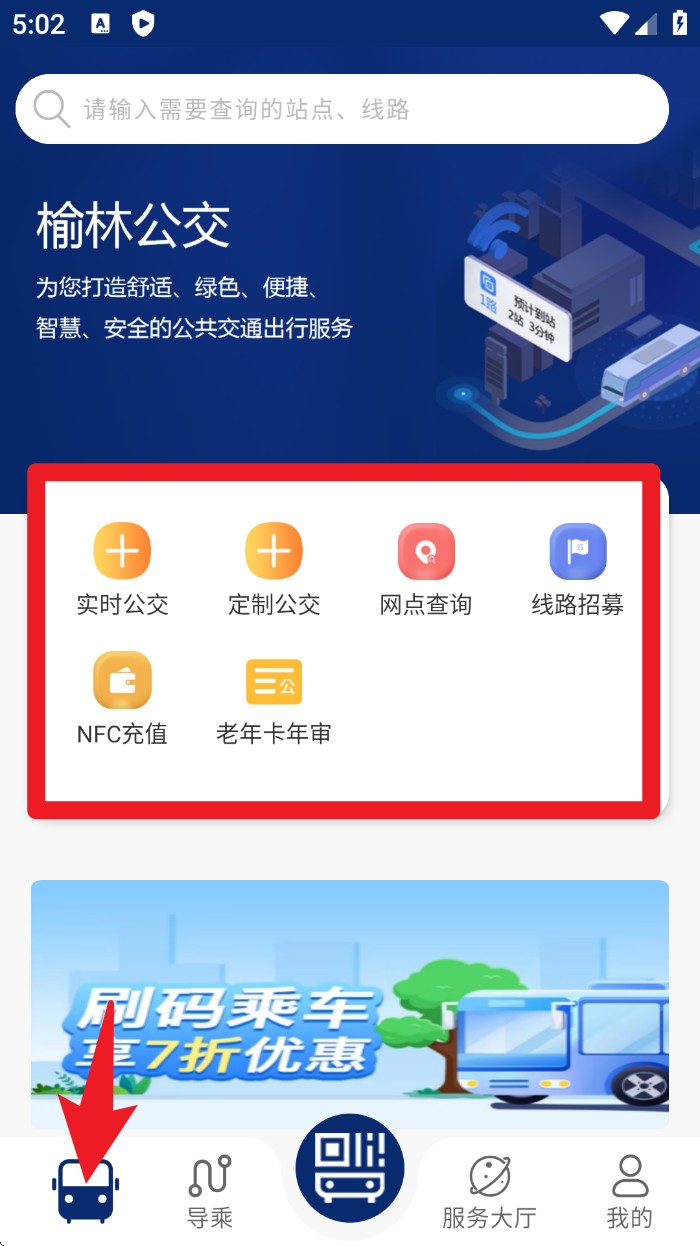 1. 在首页点击底部“首页”按钮,可进入公交功能区,使用实时公交、定制公交、网点查询、NFC充值等服务。