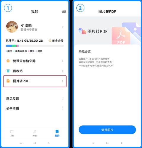 除了相册PPT图片自动转为PDF外,您也可以手动将图片转为PDF,在云盘“我的”>“图片转PDF”,选择手机相册的图片转为PDF即可。