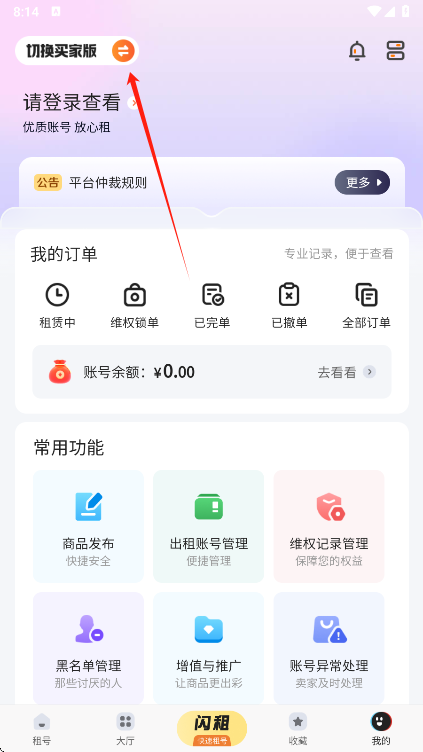 2、点击右上角的切换卖家版,就可以看到切换完成,享受不同身份的租号服务了