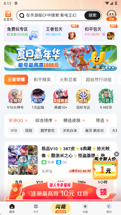 1、我们来到首页进行租号服务,可以看到提供了免费玩专区,王者包天,和平包天等等一系列的服务