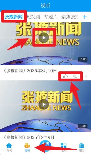 3、在视听页面,点击“张掖新闻”,用户可在视频下方点赞或发表评论。