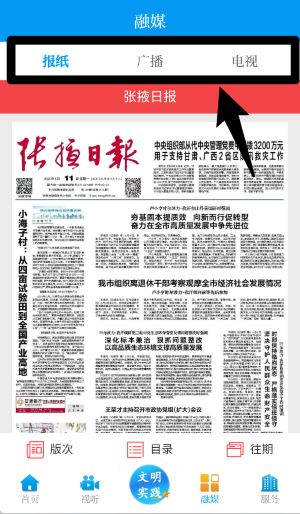 4、在融媒体页面,可切换报纸、广播、电视三种媒体形式浏览张掖日报等本地媒体资源,即可访问。