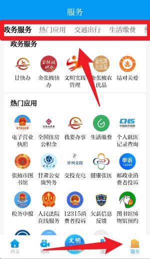 5、在服务页面,可在政务服务、热门应用、交通出等分类中选择所需服务,例如电子营业执照、全国住房公积金等。