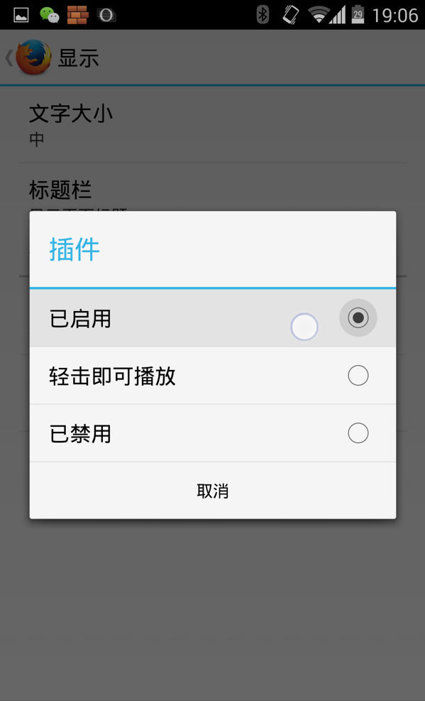 你也可以在“菜单”→“设置”→“显示”→“插件”中选择“已启用”,这样火狐浏览器会自动在网页中打开Flash。