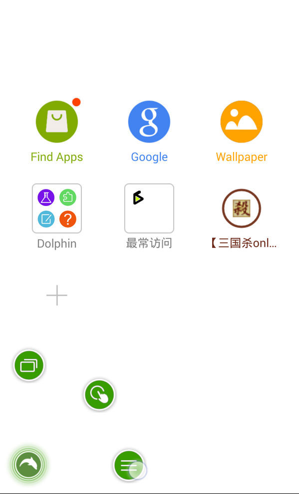 如果你选择了海豚浏览器,在安装后打开它,点击左下角的绿色小海豚图标(菜单),再点击它右侧三个横线的绿色图标进入设置界面: