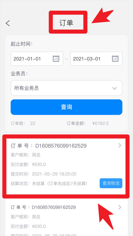 4、在订单页面,用户可以根据时间和业务员条件进行筛选,查看订单号、客户信息、支付金额及物流状态,帮助医生高效处理业务。