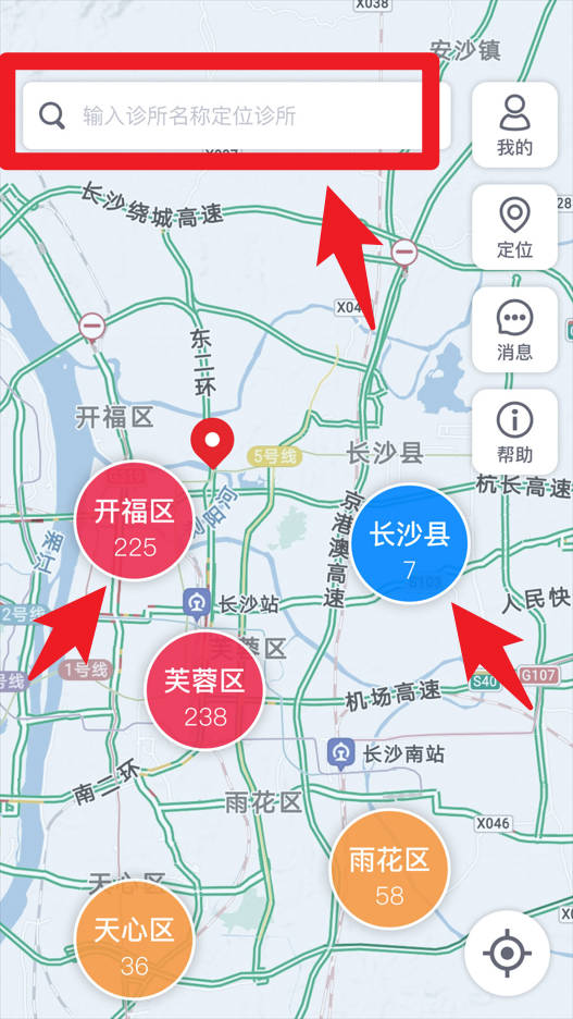 2、在地图页面,用户可以通过输入诊所名称来快速定位到诊所位置,同时还能查看各个区域的诊所数量,方便选择就近的服务点。
