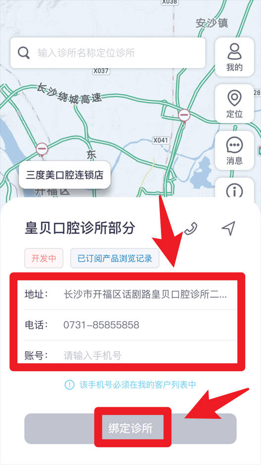 3、当选择诊所后,页面会显示详细的地址、电话及绑定入口,用户需要输入手机号完成绑定诊所操作,确保信息同步和管理便捷。