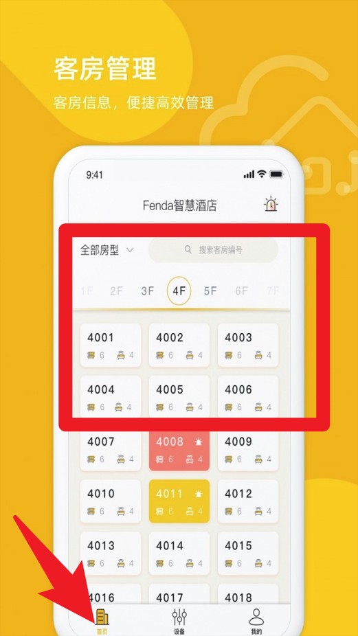 2. 登录成功后进入首页,点击左下角的「客房」图标查看楼层与房间分布。