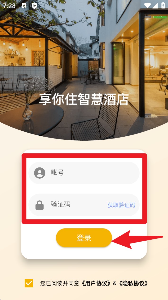 1. 打开 App 后,输入账号与验证码,勾选协议并点击按钮完成登录。