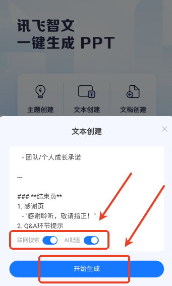 4.粘贴后开启ai配图和联网搜索,点击开始生成。