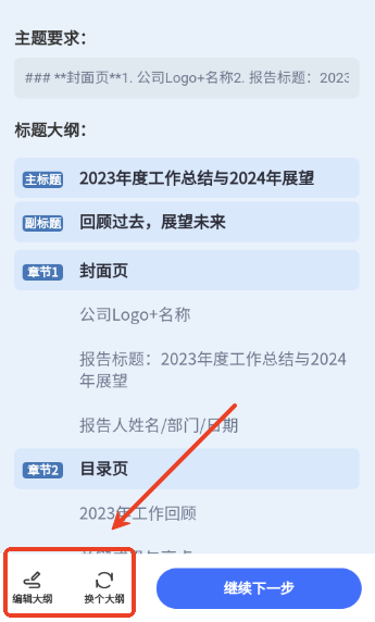 5.在生成后可以点击编辑或者换个大纲,编写完成后可点击继续下一步。