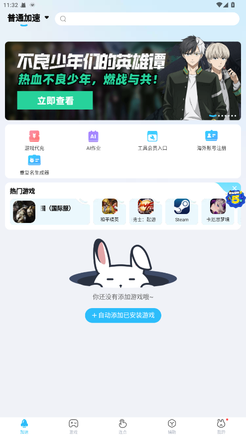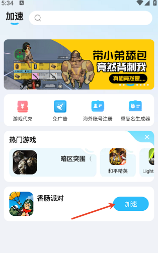1.打开迅猛免加速器首页,会自动显示手机中已安装的游戏,点击右侧的”加速“即可开启加速。