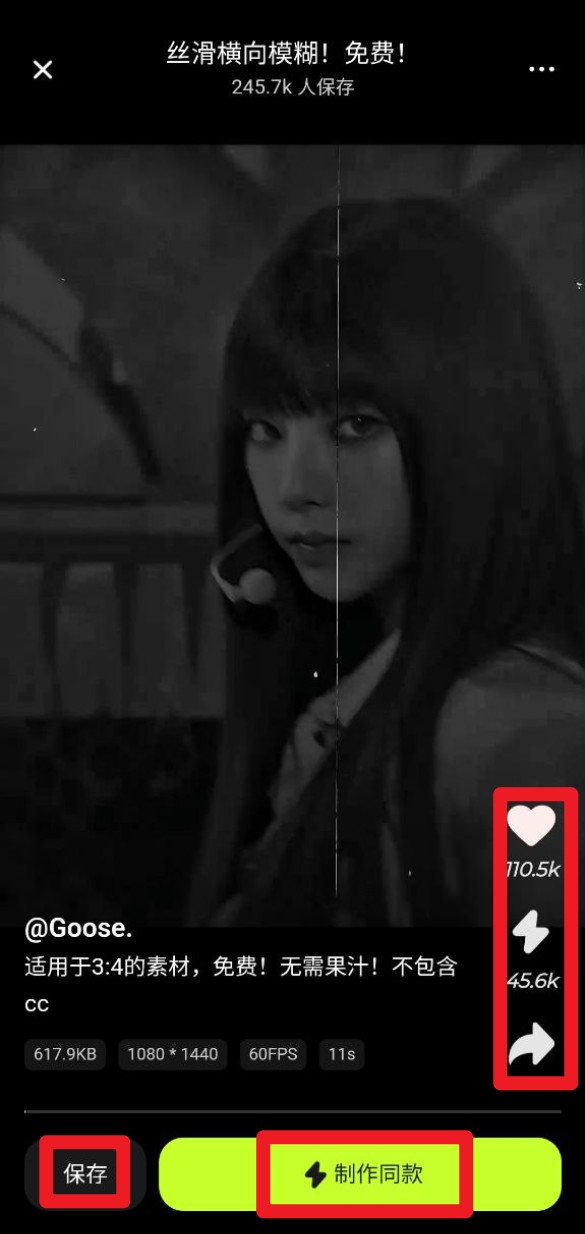 2. 在模板详情页点击「制作同款」,可快速创建属于自己的视频项目,也可点击「保存」或点赞、转发模板。