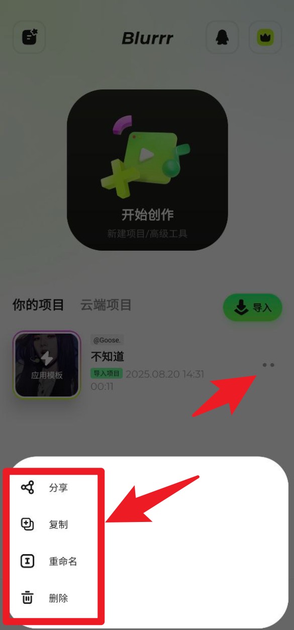 4. 点击项目右侧「…」按钮,可进行分享、复制、重命名或删除等操作。