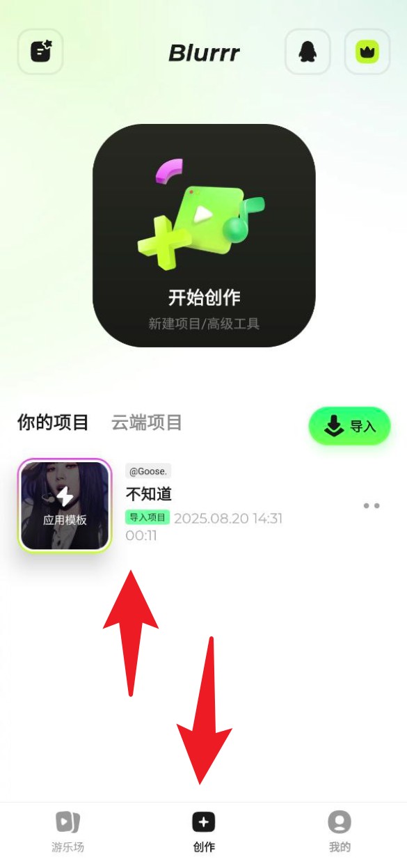 3. 切换至底部「创作」页面,在「你的项目」中可查看当前模板项目,点击可进入编辑。