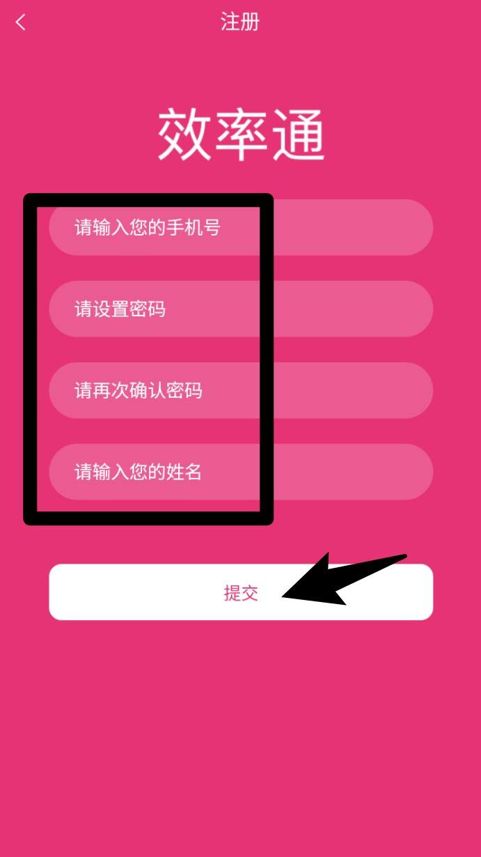 1. 打开效率通 App 后点击“立即注册”,依序填写手机号码、设置密码并确认,再输入姓名完成注册。