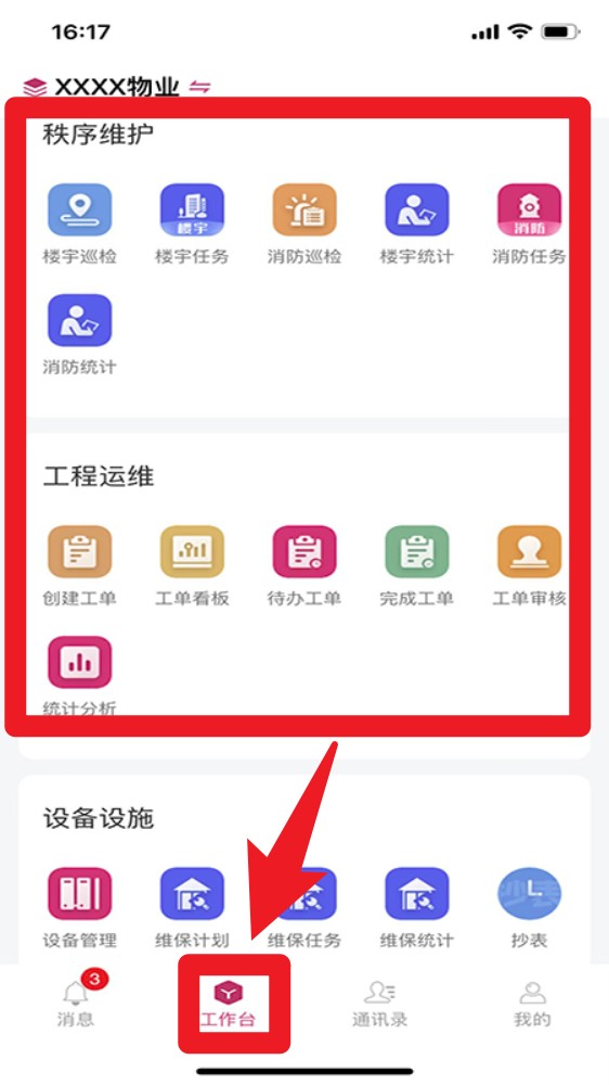 3. 成功登录后点击底部“工作台”标签,可进入秩序维护、工程运维等功能模块。