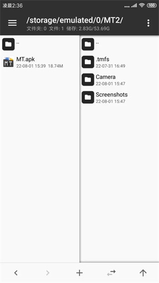 进入MT管理器,首先看到的是左右两个文件列表窗口。