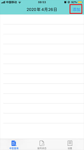 1、首先在手机上打开小客车摇号app,并在我们中签查询界面,点击添加可以新增摇号人员