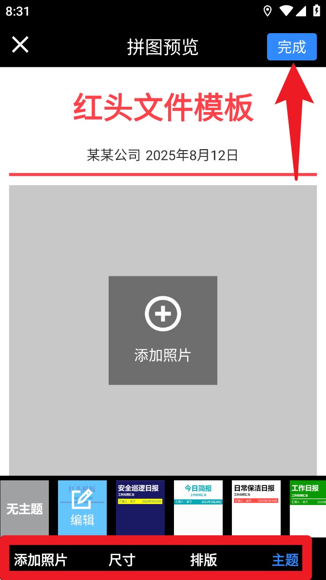 2. 在拼图预览页面,点击“添加照片”上传图片内容,选择底部主题样式,完成后点击右上角“完成”按钮保存拼图。