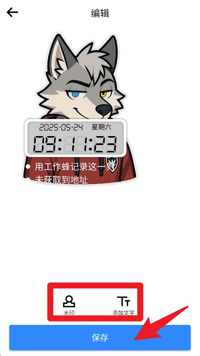 3. 在图片加水印功能中可在底部选择添加“水印”或“文字”,如时间戳、位置、工作记录等内容,编辑完成后点击“保存”导出图片。