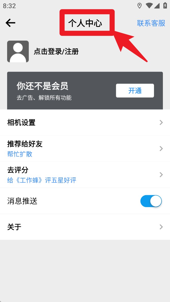 4. 点击左上角头像,进入“个人中心”页面,可登录账号、开通会员、管理推送设置或进行App评价与分享。