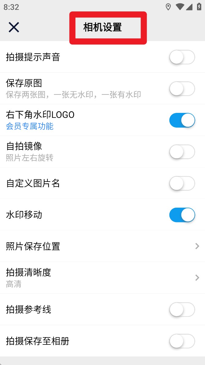 5. 在“相机设置”中可开启/关闭拍照提示音、保存原图、水印位置调整、自定义命名等功能,提升使用便捷性。
