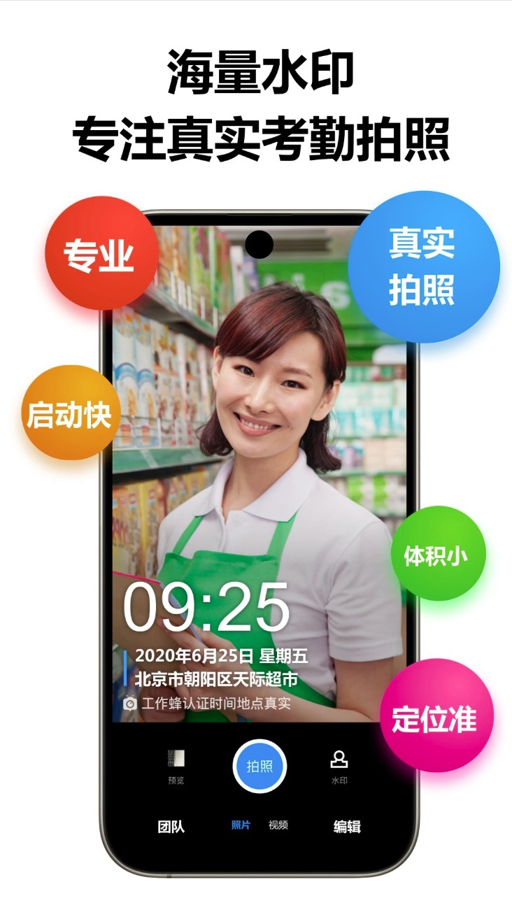工作蜂水印相机是一款专为企业与团队打造的真实拍照与考勤管理工具,拍摄的时间与地点均基于国家标准时间与卫星定位,无法修改,无滤镜无美颜,确保影像真实可靠。所有照片仅保存在工作蜂App内,不会出现在手机相册,防止被第三方软件篡改。