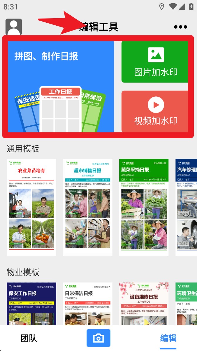 1. 在主界面顶部可选择“拼图、制作日报”、“图片加水印”或“视频加水印”,进入对应模块开始编辑操作。