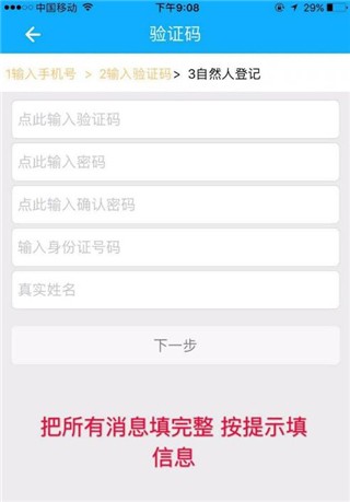 6、把下图的所有信息填完整。首先,输入发过来的验证码。再设置一个登录密码并且再次输入确认密码。最后,输入我们的身份证号码和真实姓名。点击下一步。