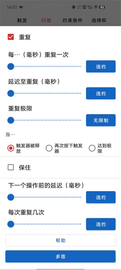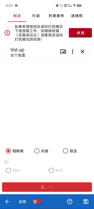 点红色的加号,点下边的记录触发器,按一下音量加,等会音量加就是连点击的开关。