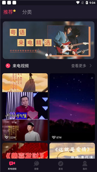 2、进入软件后,在“来电视频”中分为两个版块:推荐和分类,其中推荐版块中就是近期都非常热门的一些视频;