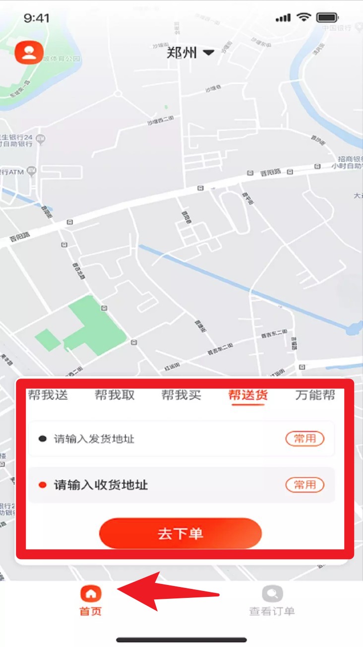 2. 注册成功后进入首页,在顶部输入发货与收货地址,选择对应的跑腿服务类型后点击「去下单」。