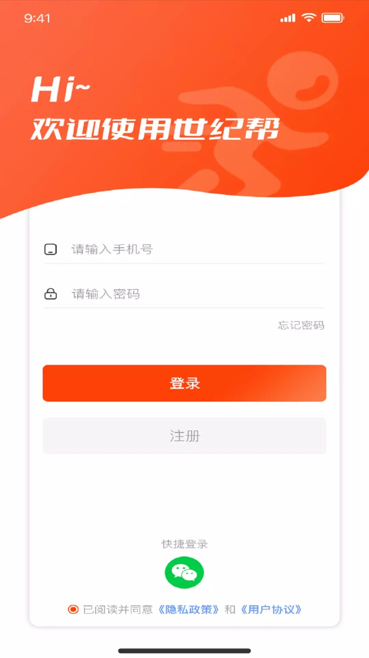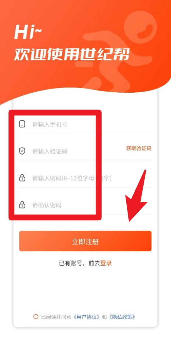1. 打开世纪帮 App,点击注册页面,填写手机号、验证码及密码信息后点击「立即注册」。