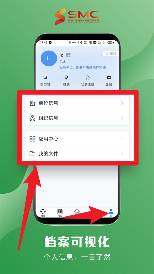 4、在“我的”页面可查看单位信息、组织信息、应用中心及个人文件等内容,实现档案信息的可视化与集中管理。