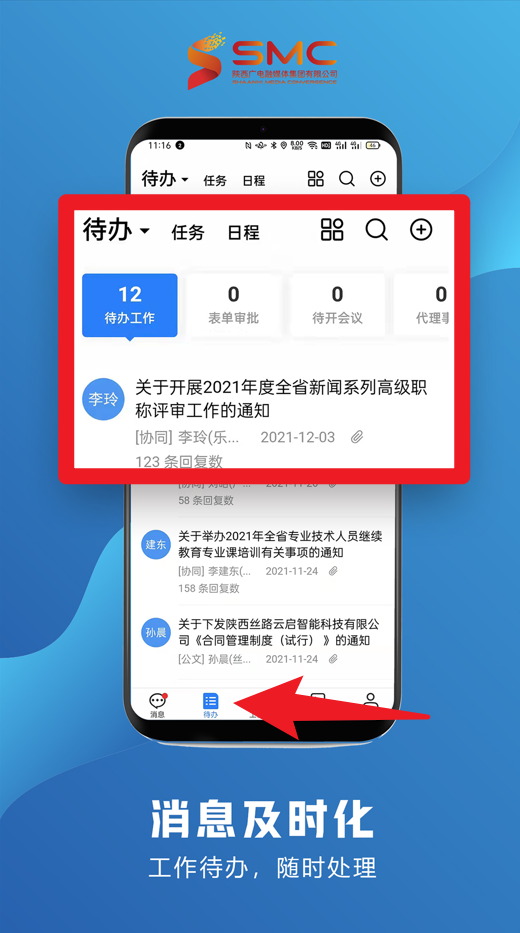 2、在“待办”页面可实时查看待办工作、表单审批、待开会议及代理事项等内容,确保工作任务能及时处理。
