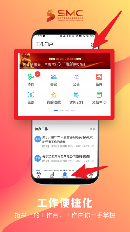 3、通过“工作门户”可便捷访问协同、会议、公告、新闻、签到、收藏、时间安排、文档中心等核心工作入口,高效管理日常事务。