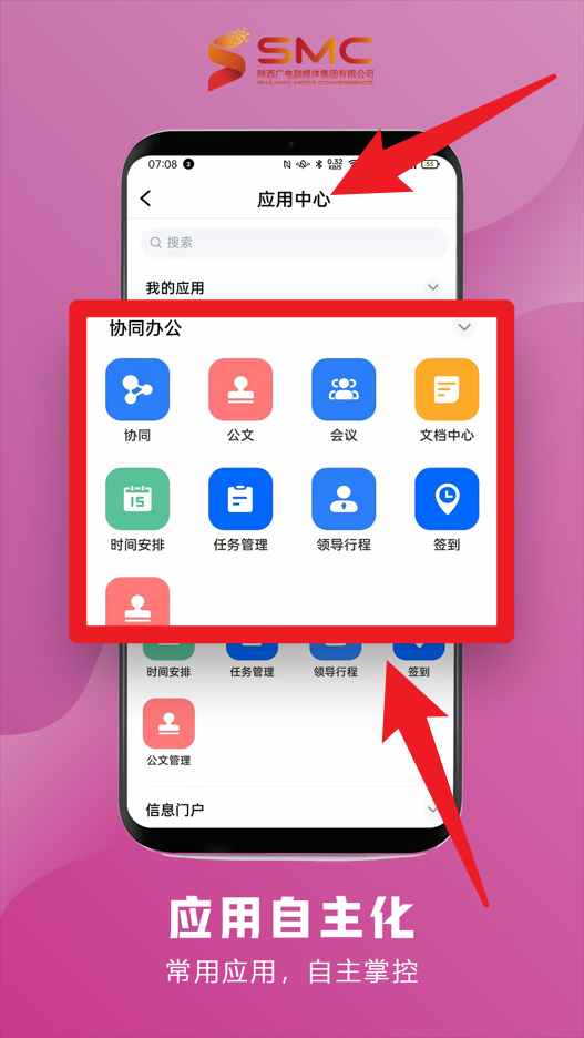 1、在“应用中心”中可根据个人需求自主添加或管理常用应用,包括协同、公文、会议、文档中心、时间安排、任务管理、领导行程、签到等功能模块。