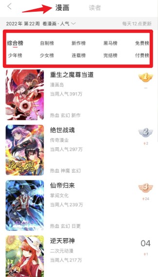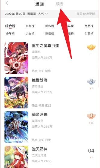 3、在漫画排行榜页面中,可以点击上方“读者”标签查看读者相关的漫画榜单与推荐内容。