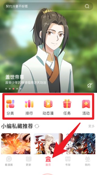 1、首页功能区包含分类、排行、动态漫、任务和活动等多种入口,方便快速找到想看的漫画类型。