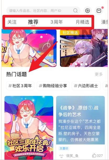 5、有热门话题及“关注”“推荐”“3周年”等标签栏,方便快速切换不同内容分类。