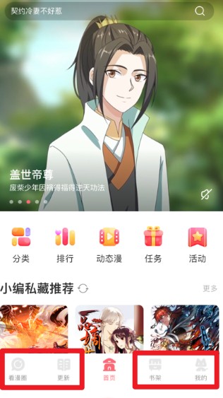2、也可以通过底部导航栏选择“看漫画”或“书架”等功能进入不同的阅读区域。