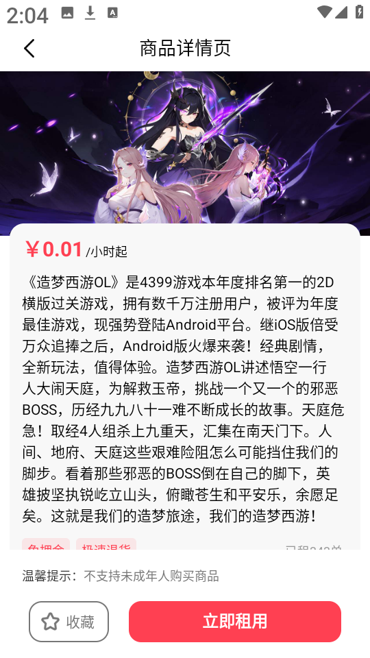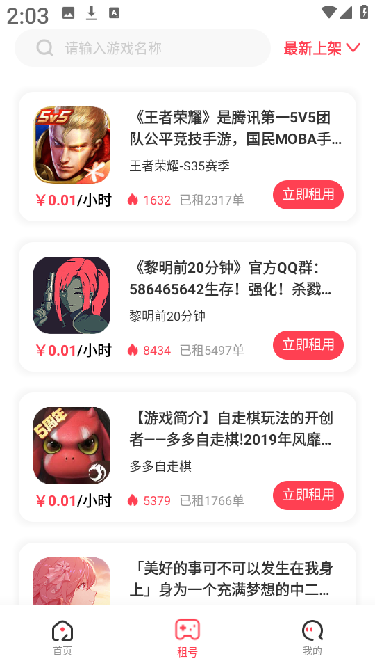 4、任意选择一款感兴趣的游戏账号,直接点击“立即租用”即可。