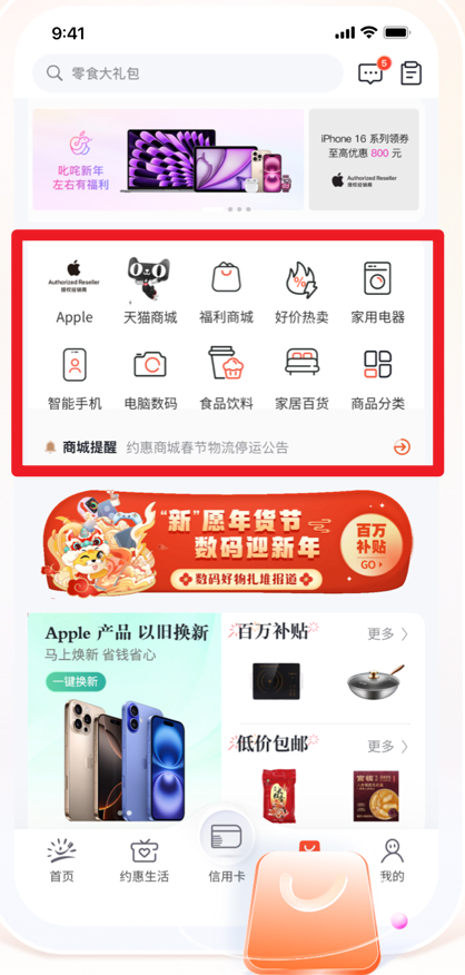 4、在商城页面,可以浏览Apple、天猫、家电、食品等丰富商品,配合积分兑换和优惠活动,实现购物与金融服务的结合。